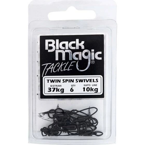 The Black Magic Twin Spin ball bearing swivels offer incredible strength and performance in a compact swivel design. Used extensively across the game fishing industry, these swivels have been made with exceptional rotational capacity and will not ‘lock up’ under extreme pressure. As with all Black Magic tackle, the Twin Spins have been vigorously tested to ensure they perform at 100% in high pressure moments. A great ball bearing swivel for trolling lures or baits for all large game fish.