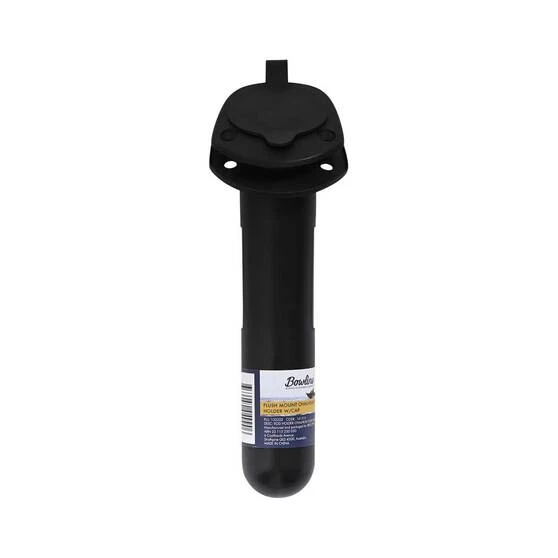 The Black Flush Mount Oval Boat Rod Holder is constructed from one piece plastic. It features a straight through deck mount and a weatherproof cap to protect your rods from the elements.