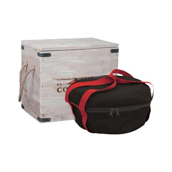 The set includes a 4.5qt camp oven with a trivet, perfect for baking fresh bread or cooking up some chilli con carne, a 24cm folding griddle frypan, a lid lifter and gloves. Itcomes in a carry bag and an attractive wooden storage crate providing a handy and versatile storage solution. If you are looking for a quality cooking set that will last you a lifetime if taken care of, this is the perfect product for you!