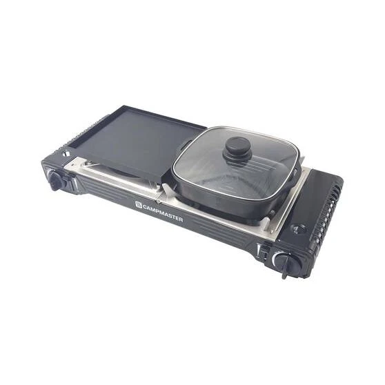 The Campmaster Butane Combo Stove has a patented two-stage safety shut off device, consisting of an over-pressure gas shut off and over-pressure canister ejection shut off. So you can be assured of its safety! Designed with one cast alloy burner and one stainless steel flat ribbon burner, camp cooking just got a whole lot easier! This combo stove comes with plenty of accessories including a cast alloy nonstick cooking plate, cast alloy nonstick deep dish with glass lid. Utensils included are a spatula, multi scissors, tongs and spoon. All of this comes in a specially designed carry case with clip-in slots for an additional 2 x 220gram butane canisters, making this stove package great value for money!