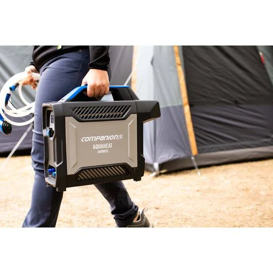 The Companion Aquaheat Water Heater uses a unique new compact design to get your hot water going without the fuss. This pack includes a pump, water hoses, DC lead and a shower head. The brushless pump has an auto Ignite / Re-light electronic ignition for ease of use. A great way to get a hot shower on the campsite.