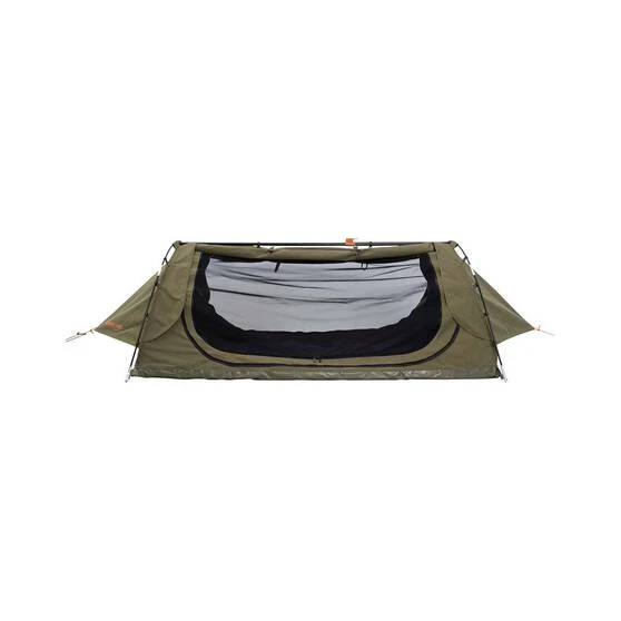 You’ll be having a bevvy around the campfire in no time with the simple set up of the Dusk to Dawn Swag. Simply peg it out, insert the 2 compose end poles and the trigger locking ridge pole and you are ready to go. The Dusk to Dawn has excellent ventilation with 2 large super-fine 125gms mesh doors and 2 zip down windows. The storm covers convert to awnings for added shelter and protection from the elements (poles sold separately).