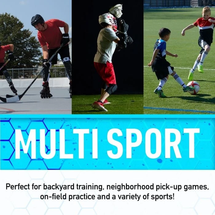 This is the ultimate goal for multi-sport training by young athletes. Since the year has many seasons and with each season you may change your sport, this goal has you covered. Made using a durable 1.25-inch steel frame with a 50-inch wide opening; this goal is perfect for backyard training, neighborhood pick-up games and coaches on field practices. The rugged goal measures 50 by 42 by 26 inches (W x H x D) and can be used on any lawn or field (anchored with ground stakes- included) or pavement. This all-purpose goal offers great performance and holds up to constant play, shot after shot. Download Instruction Manual