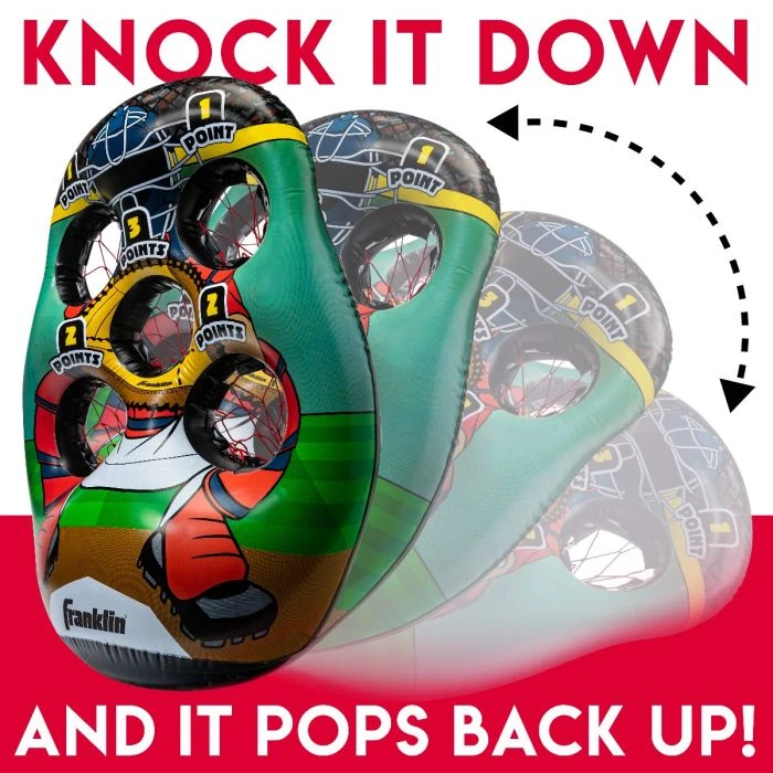 Who says baseball has to stay on the field? With the Franklin Sports inflatable 5-hole baseball target set, kids have everything they need to take their baseball practice to the next level, whether you’re in your backyard, basement or at the beach! This set includes a manual hand air pump to use to inflate the (3) 3†baseballs. The rotation molded baseballs’ size and weight make them very versatile for indoor and outdoor play. They’re fun for all ages and abilities, and perfect for little league baseball players (3-6 years old) or older players looking to improve their ball control and accuracy skills! The baseball target inflates to nearly 45″ inches tall and has 5 target holes included, making it the perfect dynamic practice partner for pitching drills, whether you’re tossing solo or passing with another player. To ensure that the inflatable baseball target doesn’t get blown away by your powerful arm, fill the smaller section on the bottom with water or sand before inflating the top section with the Air pump. Whether as an addition to your athletic equipment collection or as a birthday, holiday, or anytime gift, you’re sure to score with the Franklin Sports inflatable 5-hole baseball target set!