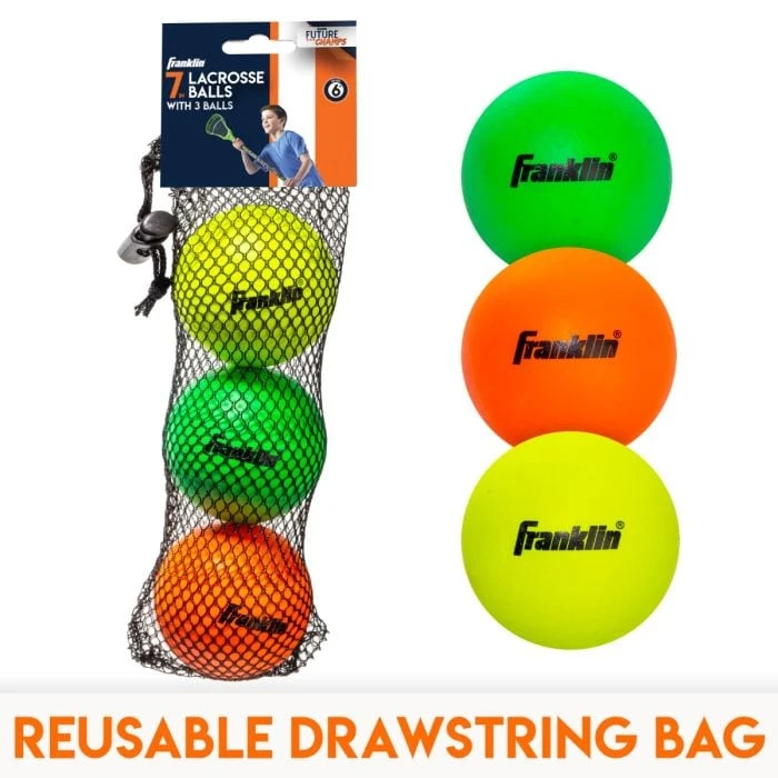 The Franklin Sports Youth Lacrosse ball 3-pack is the perfect set to get your little athletes involved in the sport of lacrosse for the first time! Each ball is 7 inches in circumference, a little smaller than a regulation lacrosse ball (~7.75 inches). This slightly smaller size allows for kids to better learn to control the ball when in play, making it easier to throw, catch and learn stick handling. This soft rubber lacrosse ball is less hard and less heavy than a regulation lacrosse ball, allowing kids to master the fundamentals of throwing and catching before graduating to a more advanced set. The balls are perfect for recreational, backyard play. The pack comes complete with a reusable drawstring mesh bag, so you can pack up the balls after each use, never misplacing the set! Get your kids outdoors and introduced to the exciting, growing sport of lacrosse for the first time with these perfect introductory lacrosse balls, in three vibrant colors for increased visibility while learning!