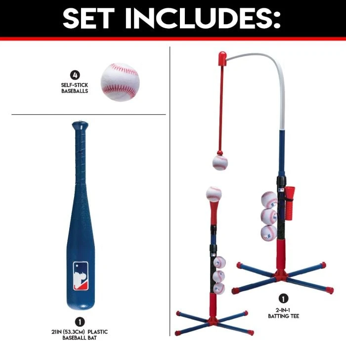 - ALL INCLUDED: This set comes complete with the Grow-with-Me Batting Tee, (1) 21 inch plastic bat, and (4) baseballs with self-stick covers, providing you with everything you need to play!