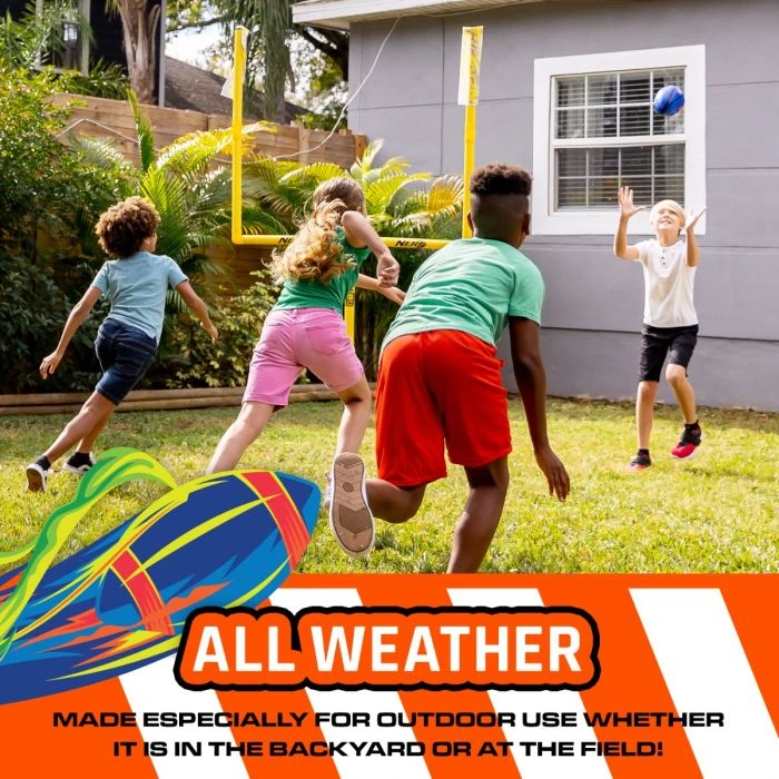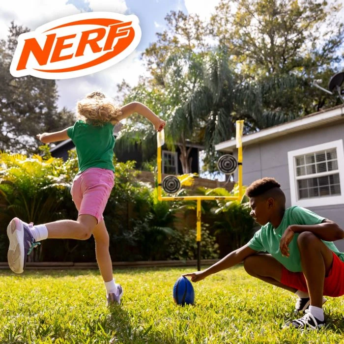 Become an all-star football player with the NERF Punt and Pass Football Goal Post Set! The all-weather construction is durable and has an authentic look and feel. It features 3, 10” NERF knockout targets that can easily be removed and placed anywhere on the goal post to improve your accuracy. This set has everything you need to turn your backyard into a pro football game!