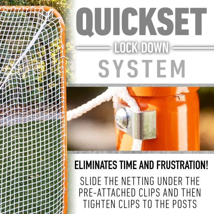 The Quikset lacrosse goal features the quality and durability you’ve come to expect with Franklin Sport’s steel goals, but sets up in a fraction of the time! The exclusive Quikset lockdown system eliminates the time and frustration of conventional rope tie assemblies. The goal includes premium steel tubing, a rugged heavyweight all-weather pre-fit net with reinforced net edging and a durable tarpaulin back pocket. Shoot on this goal with confidence! Goal Size: 72″ (W) X 72″ (H) X 72″ (D)