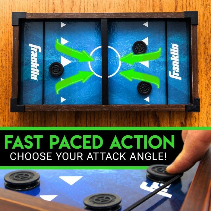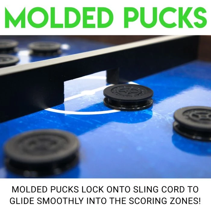 - SLING PUCK: Use the included rubber slings to clear your side of all the pucks before your opponent can clear theirs! A fun, fast paced game that the whole family will love