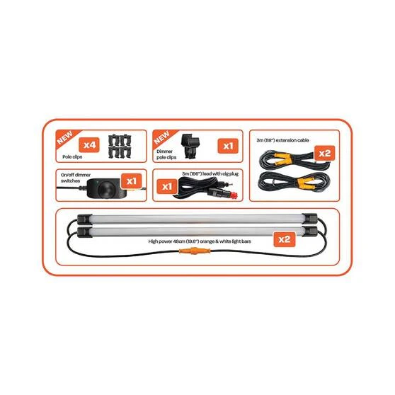 The Hardkorr2 Bar Tri-Colour LED Camp Light Kit has been designed for illuminating your campsite in full thanks to the two bars included. The 48cm bars contain both white and orange bulbs giving you the option of a bug-free campsite. The built-in magnets and removable pole clips make mounting a breeze and the removable diffuser will soften and broaden the light beam when needed. IP68 waterproof rating means the lights are completely watertight (in fact they will run underwater). The 25cm light bar is a great addition to this kit for smaller applications.