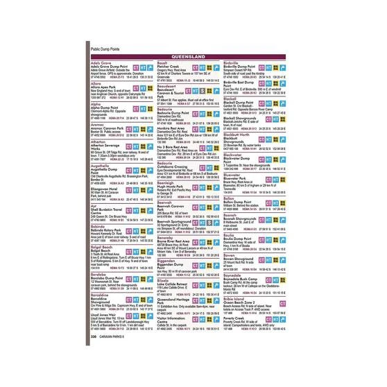 Coloured symbols are included on each listing to inform the reader about facilities such as powered sites, ensuite sites, tent sites, BBQ, pool, approximate cost, pets allowed, large sites, drive-thru sites and dump points.