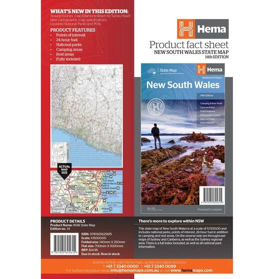 The Hema New South Wales State Map is a full map of the state at 1:1,500,000 scale. It includes detailed points of interest including 24 hour fuel, national parks, camping and rest areas. The whole thing is fully indexed. The reverse side includes the CBD and through-maps of Sydney, Canberra, and the Sydney regional area. Great for your next trip.