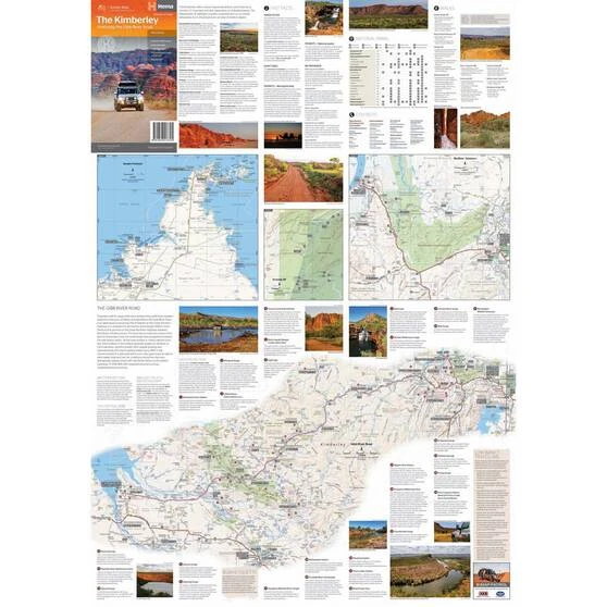 Hema’s regional map of the Kimberley features the iconic Gibb River Road. On the reverse are inset maps for Purnululu National Park, the Dampier Peninsula and the Parry Creek area. Detailed trip coverage and drive detail for the Gibb River Road is featured as well, with inset mapping covering the journey and corresponding text to guide explorers.