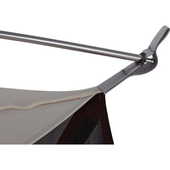- Alloy poles and alloy “v” stakes hold the tent secure in strong wind
