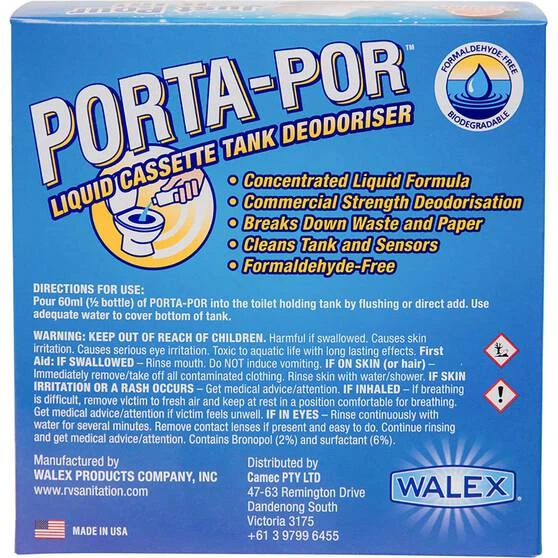 Say goodbye to troublesome waste and odours with the Walex Porta Por Liquid 6 x 120ml! Porta-Por’s formaldehyde-free super concentrated liquid formula breaks down paper and waste, cleans the tank and its sensors, and leaves it smelling citrusy-fresh for days on end. Just pour 60ml of the liquid into the toilet holding tank directly or by flushing it in and you’re all set to go—this equates to 12 treatments. You’ll be thanking yourself later!