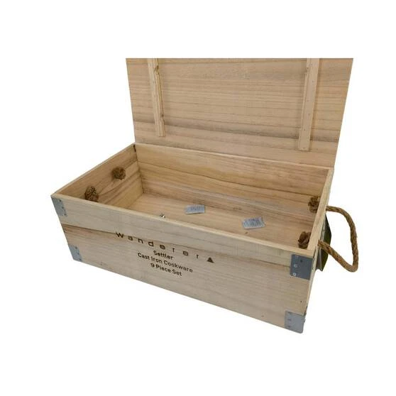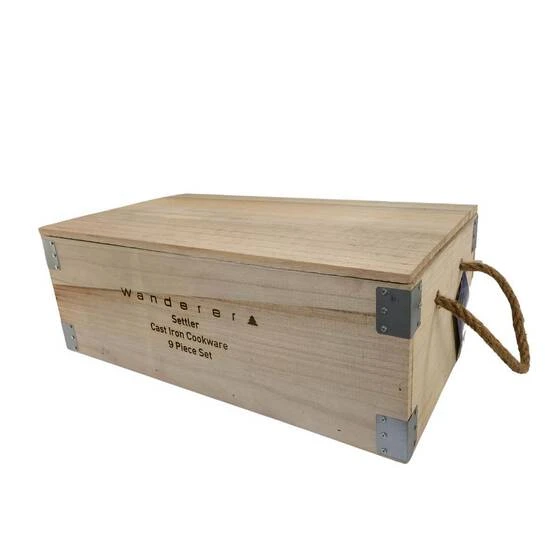 If you’re looking for a cooking set for your next camping adventure then dont look past Settler 7L Cast Iron 9 piece set by Wanderer. This set has everything you need to make cooking over the campfire a breeze. The Settler 9 piece set comes with a 7L/9QT camp oven with trivet, perfect for baking and cooking over the coals. It also includes both 25cm and 20cm frypans for frying up your bacon and eggs in the morning. The Double jaffle iron is perfect for cooking up some campfire toasties! It also comes with a lid lifter, lid stand, leather glove and a handy wooden storage crate. This set is pre-seasoned and ready to use. No need to muck around getting it ready, simply take it out of the box and start cooking up a storm! Perfect to feed the whole family, the Settler 7L Cast Iron set from Wanderer is certain to make life easier on your next camping trip!